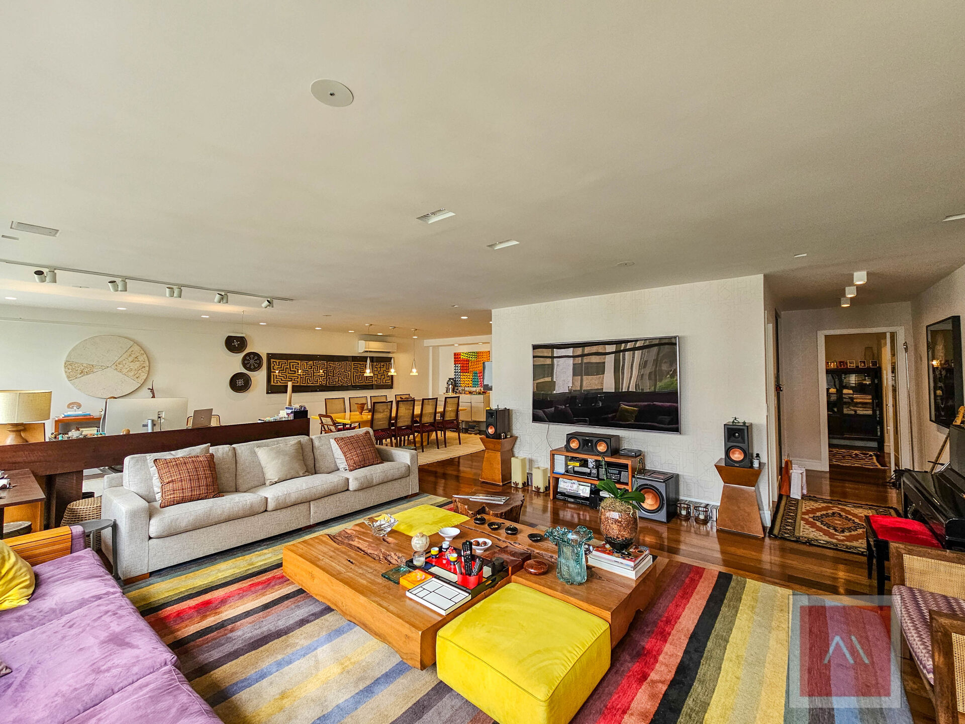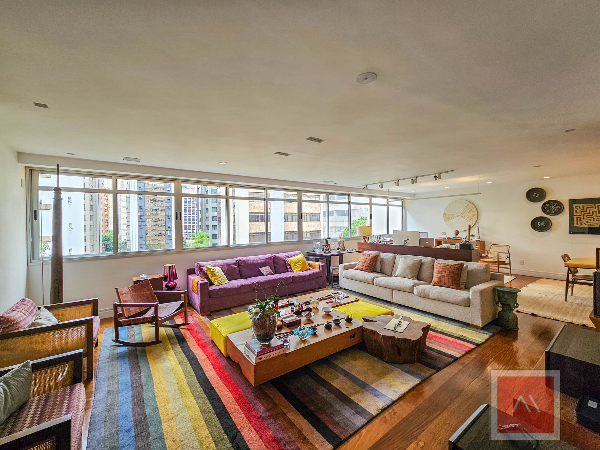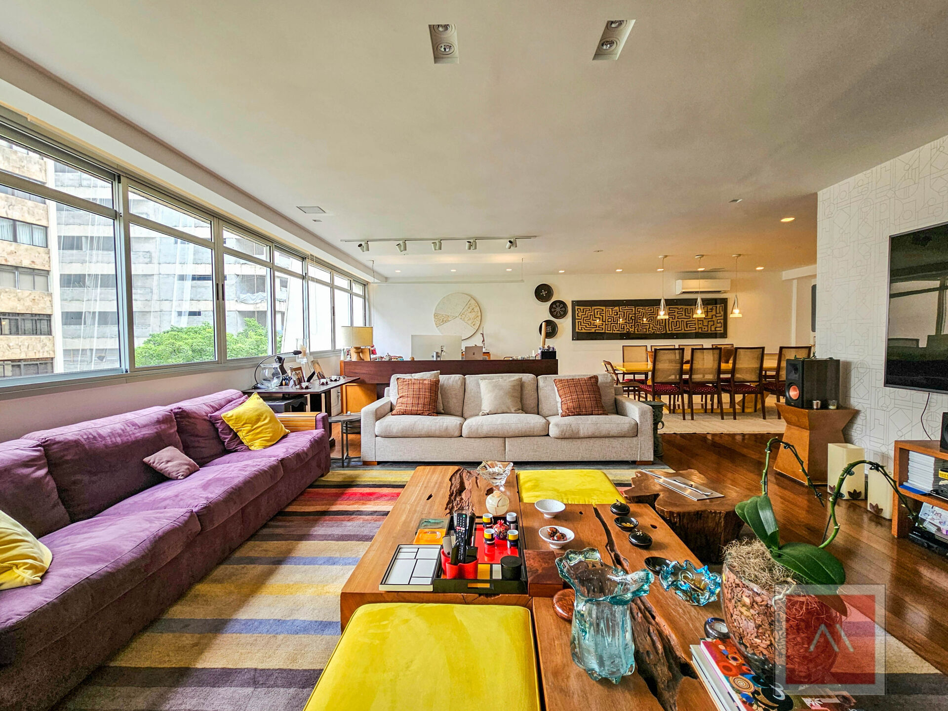 Área social: 3 salas amplas, com janelas de parede a parede e vista para as árvores, criando uma atmosfera agradável. O lavabo complementa o espaço, ideal para receber com conforto.